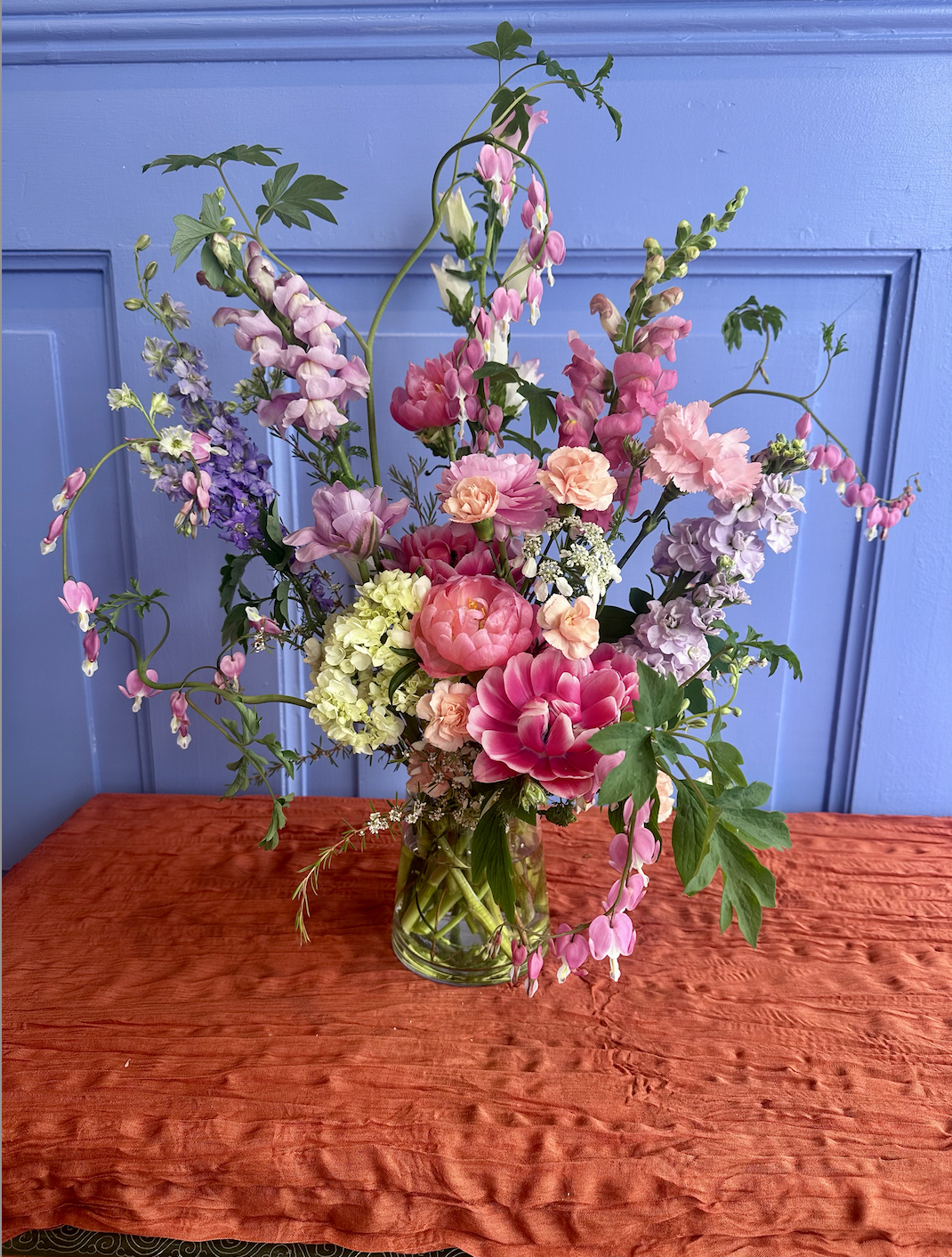 We are so delighted to be offering flowers in Bucks County, PA for this year’s Mother’s Day! This year’s offering is an absolute showstopper - featuring our favorite seasonal ingredients sourced from local farms (when possible). The "Mamma Mia” is a dazzling mix of coral charm peonies, roses, light purple stock, miniature green hydrangea, leggy snap dragons, delicate larkspur, gestural bleeding hearts and fragrant branches of lilac.*